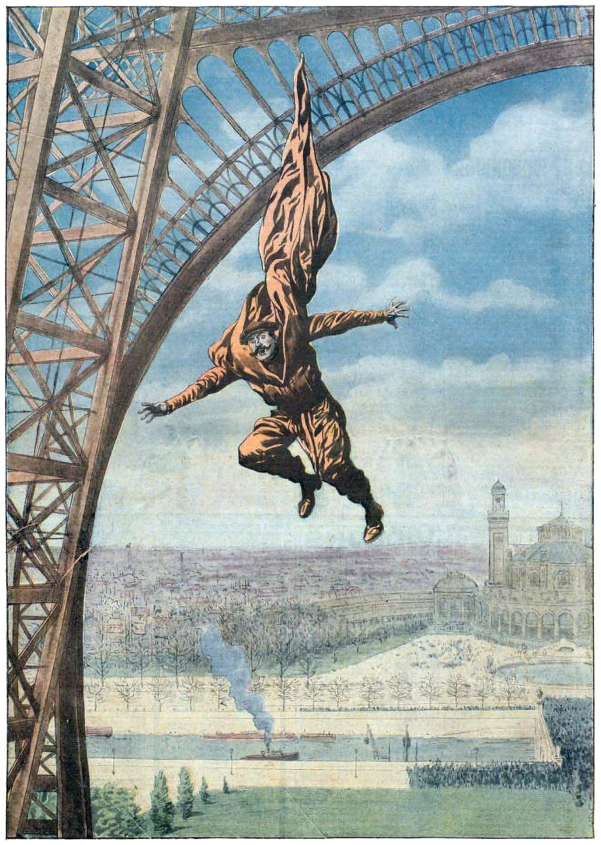 Lunedì cinque febbraio millenovecentododici, la prima pagina del Petit Parisien titola sulla pubblica esibizione di paracadutismo tenutasi il giorno innanzi e conclusasi in tragedia. Monsieur Gassion, fra i custodi intervistati, dichiara che François Reichelt si era presentato quella domenica quattro febbraio, di buon mattino, nei locali dell’amministrazione della Tour Eiffel. Con lui due accompagnatori, uno poco più che adolescente.